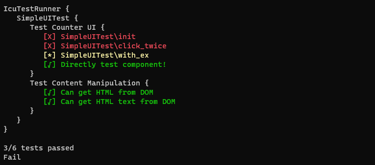 <IcuTestDiv> is basically a <div> that defines a test area where you can place your UI component(s). Here we have styled the div yellow just to discern its bounds. With the UI automation API, we locate the button and click it...twice! Click here for more automation methods.